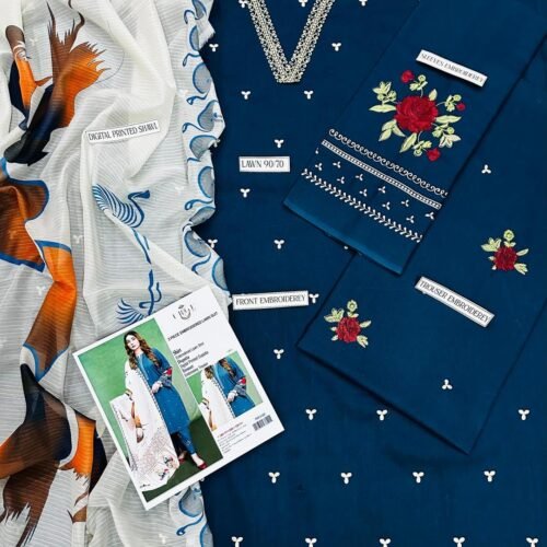 3 Pcs Women’s Unstitched Embroidered Suit (Blue)