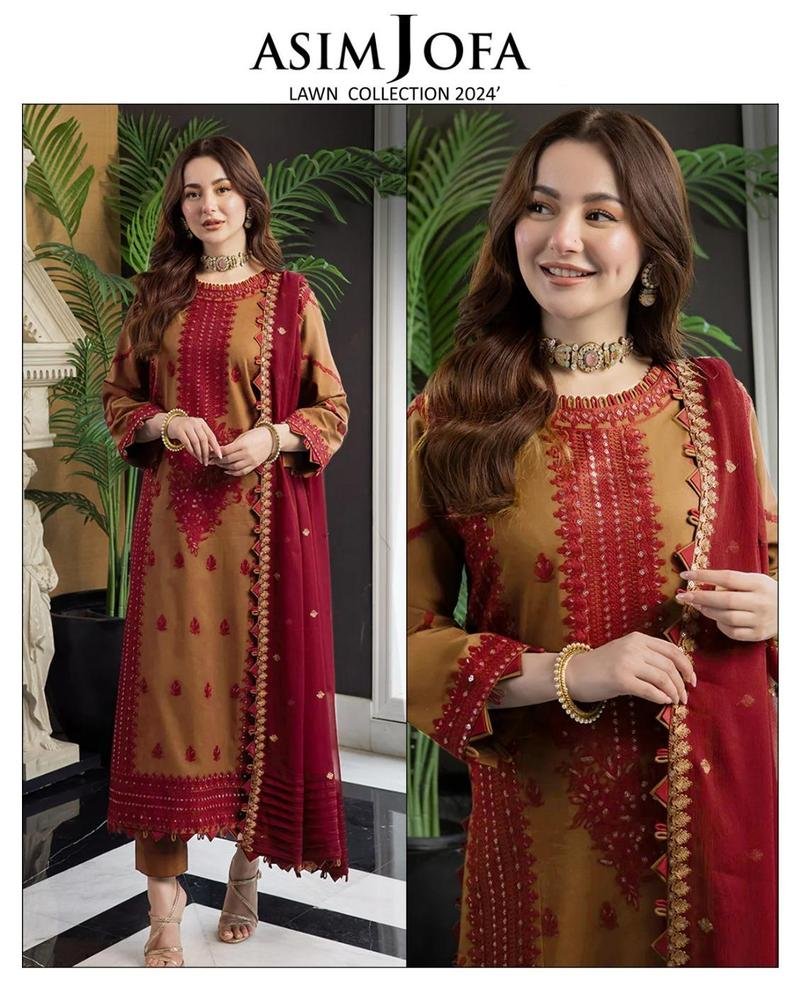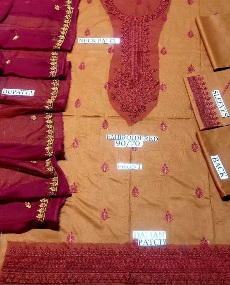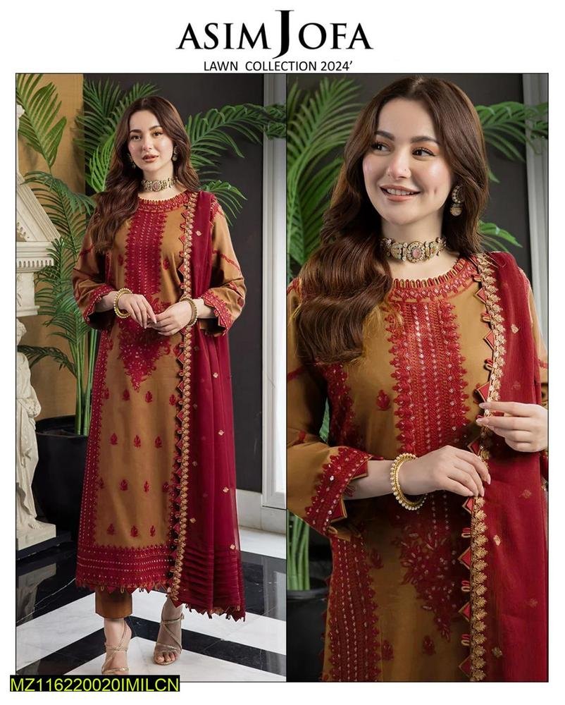 3 Pcs Women’s Unstitched Swiss Lawn Embroidered Suit – Brown